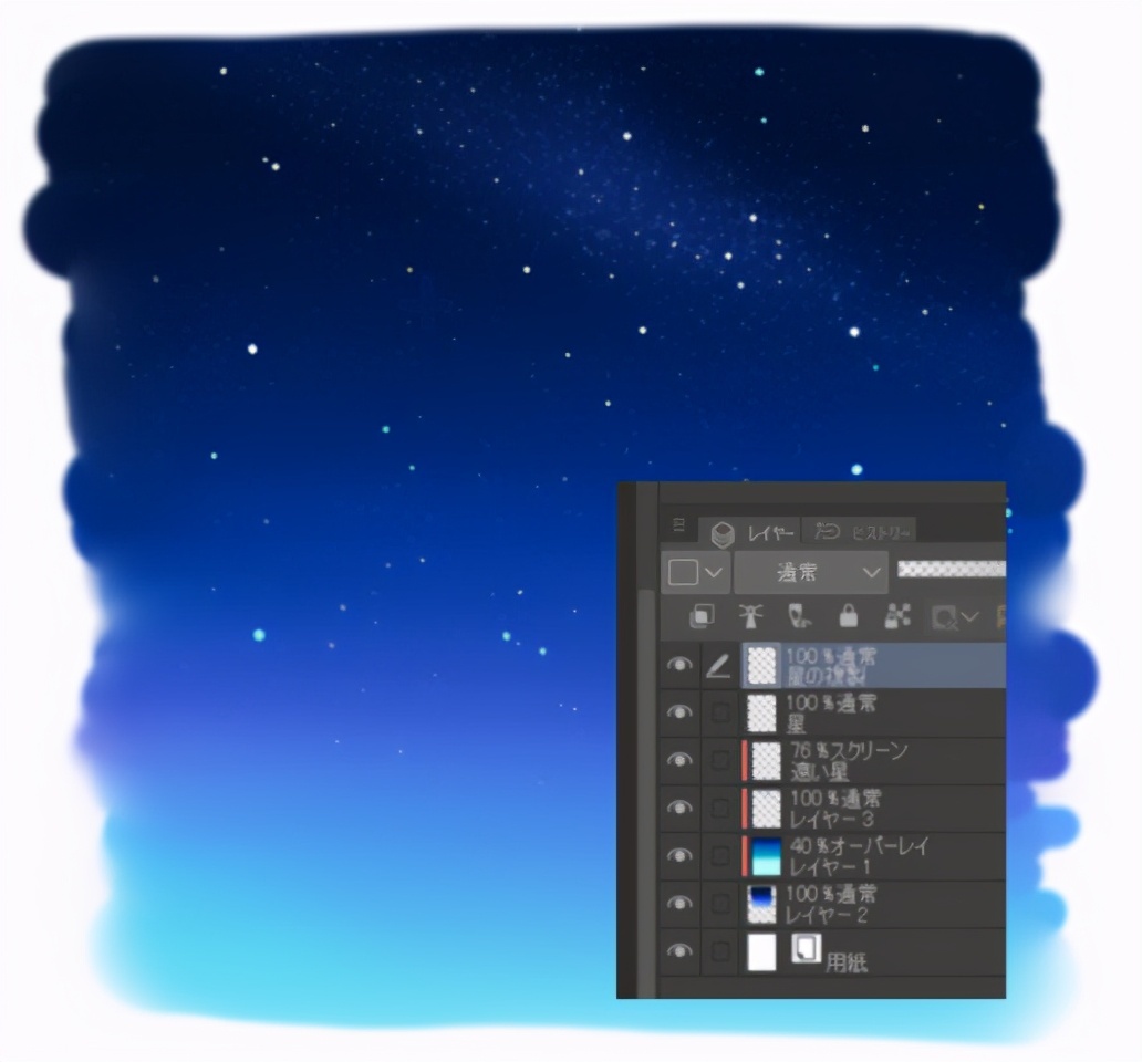 用渐变画出星空,在其上添加一张图层,用喷枪淡淡画出银河的朦胧感。